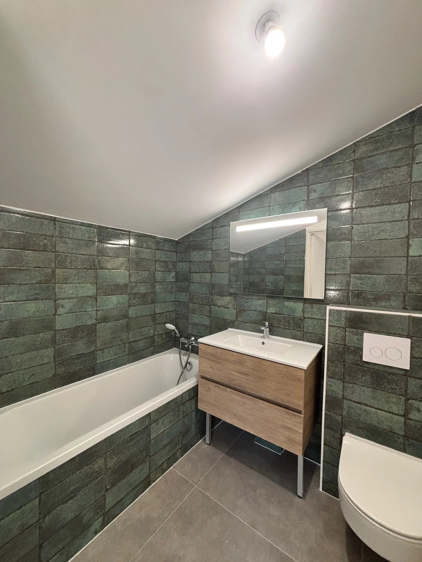 Belles prestations ( parties communes de standing, carrelage grand format, faïence toute hauteur, fenêtres aluminium K-LINE, isolation phonique et thermique, pompe à chaleur triple service...)