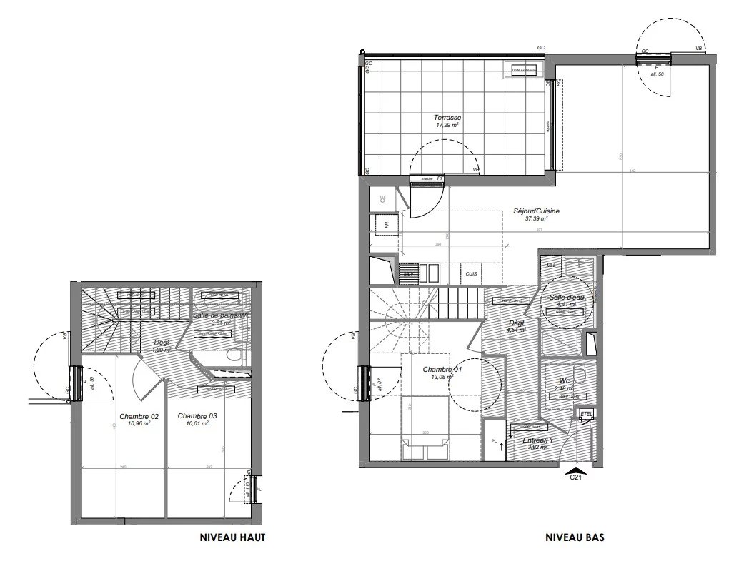 Niveau bas: une entrée avec WC suspendu séparé, une grande chambre de plain pied avec grand espace rangement sous l'escalier.
