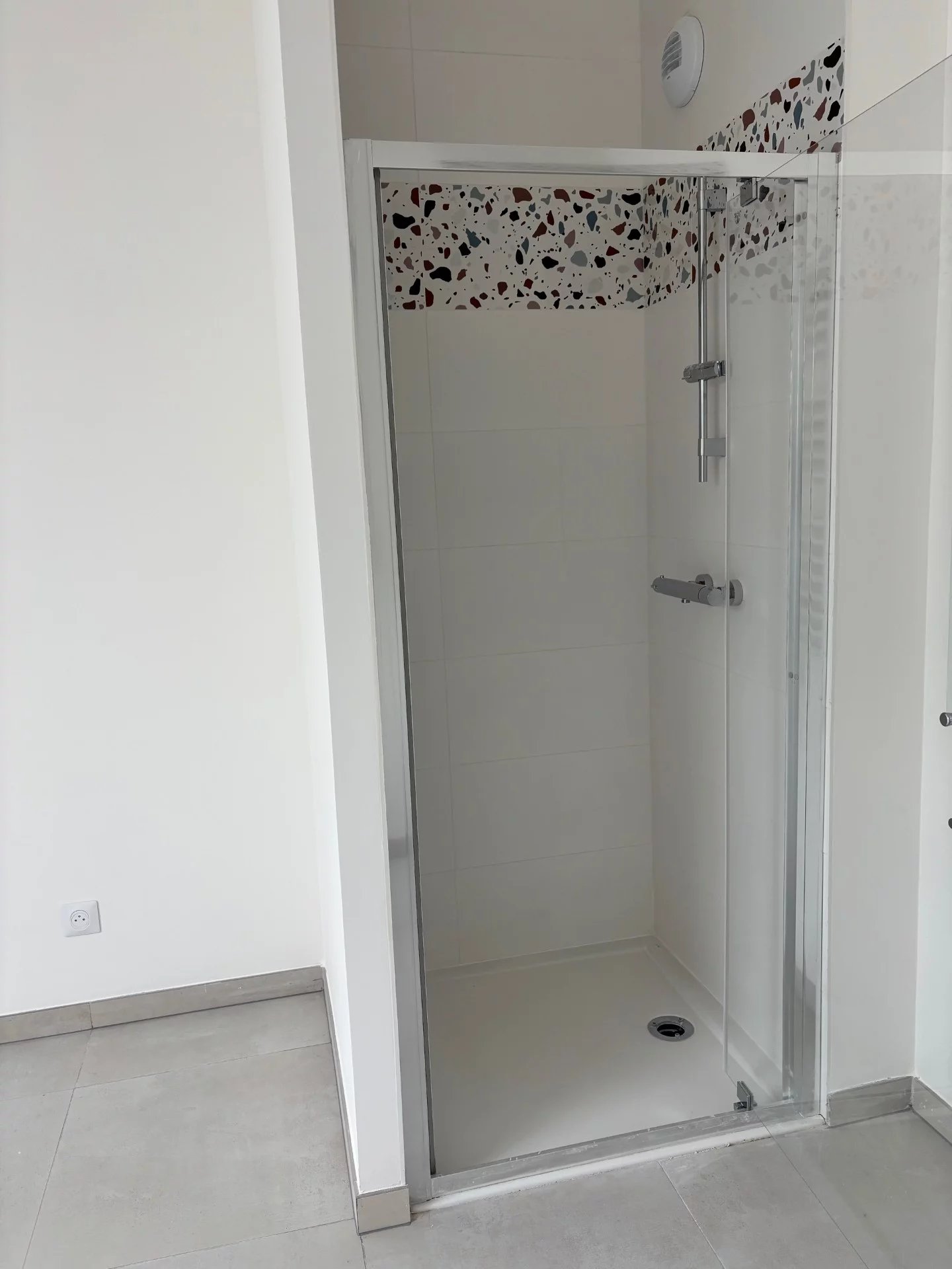 une entrée avec placard, deux chambres avec accès à une terrasse commune, une salle d'eau avec WC