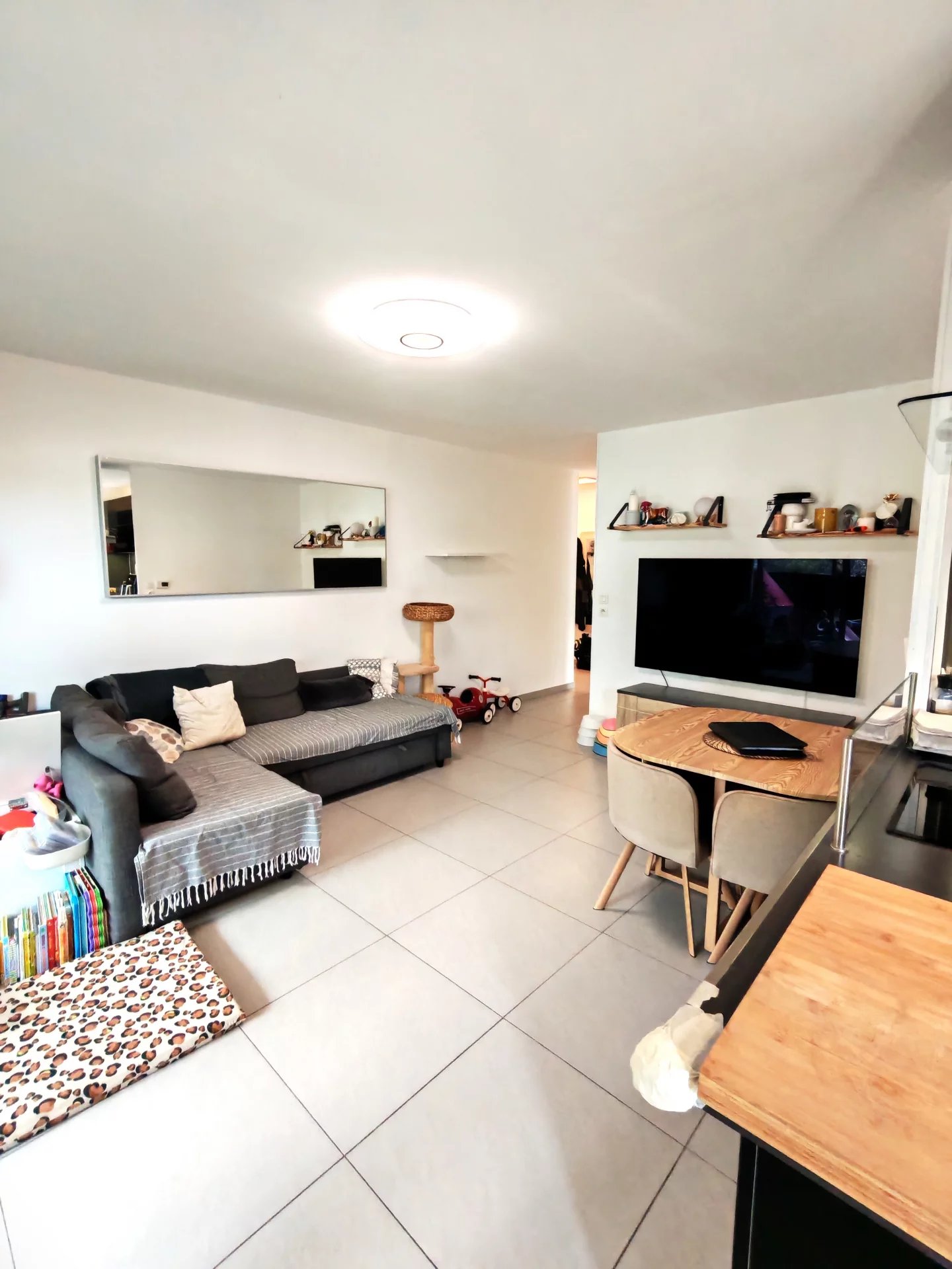 Appartement aux beaux volumes intérieurs composé d'un grand séjour-cuisine US équipée-aménagée moderne de presque 30 m², un espace fermé cellier/buanderie, salle de bains toute équipée, WC séparés, 2 chambres de bonne proportion avec placards donnant également sur la terrasse.