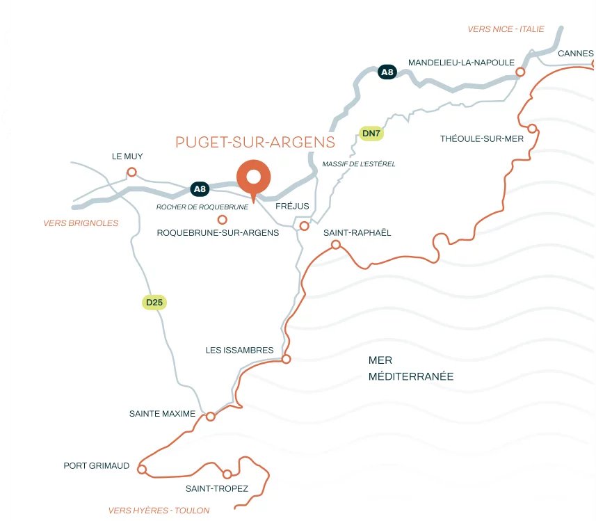 A l'Ouest du village, dans un écrin de verdure entre le lac de la Gaudrade et la rivière de l'Argens.